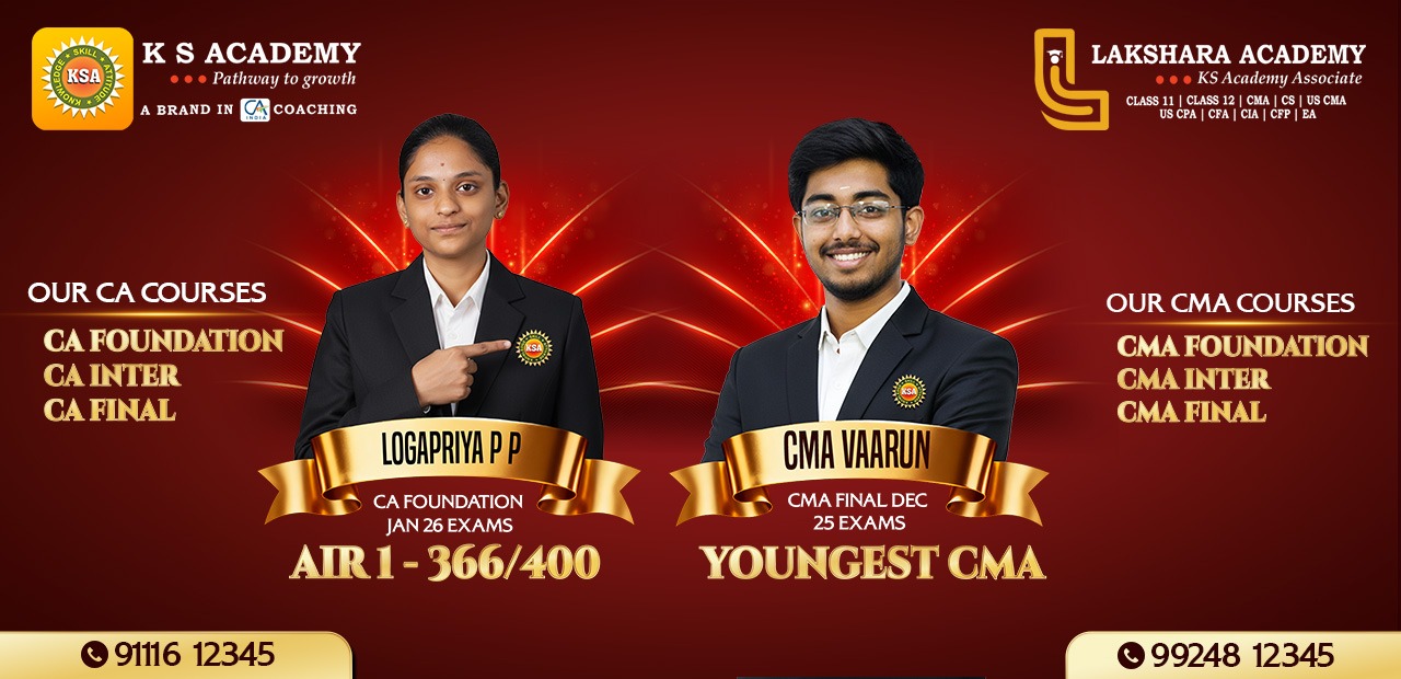 Lakshara Academy is an extension of KS Academy, which is reckoned as a Brand in CA Coaching over the past 14 years. We offer a wide range of Professional Coaching Programs from Class 11 & 12 (Commerce Stream) to courses in CMA, CS, ACCA, US CPA, US CMA, CFA, CFP, EA, and CIA. Our Institute is renowned for its Exceptional Faculty, Top-Notch Infrastructure, and Student-Centric Approach. Stay tuned as we expand our offerings to include coaching for CLAT, & Bank Exams in the near future.